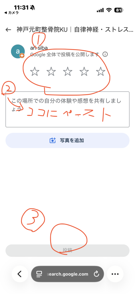ログインすると、整骨院KUのレビュー投稿画面が開きます。まず星マークをタップして評価(★)の数を選び、次に口コミ入力欄を長押ししてコピーした文章を貼り付けます。必要に応じて内容を整えたり、写真を追加することもできます。