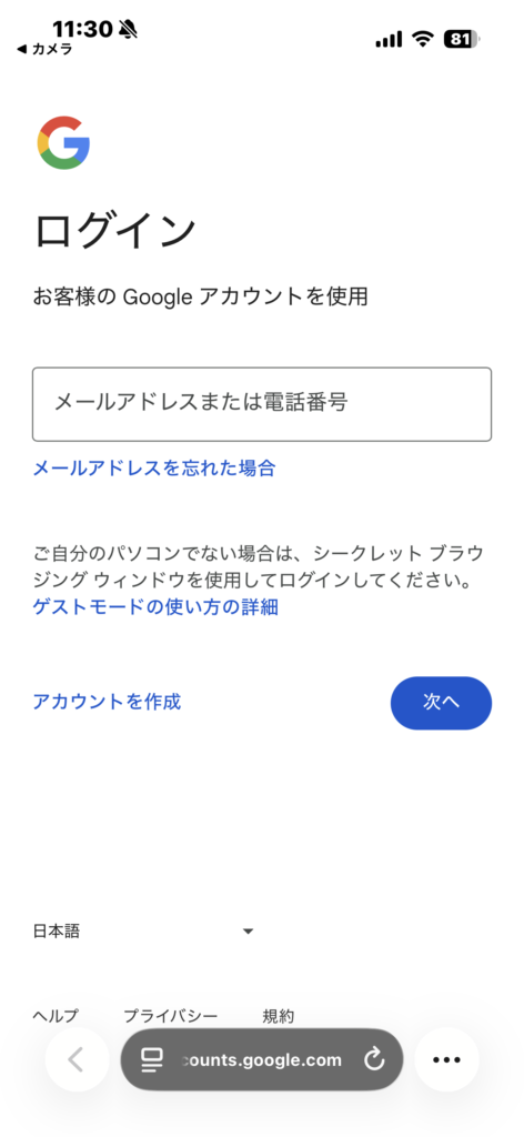 生成された口コミの下にある「Googleレビュー投稿ページを開く」ボタンをタップすると、Googleのログイン画面が表示されます。普段使っているGoogleアカウントでログインしてください。