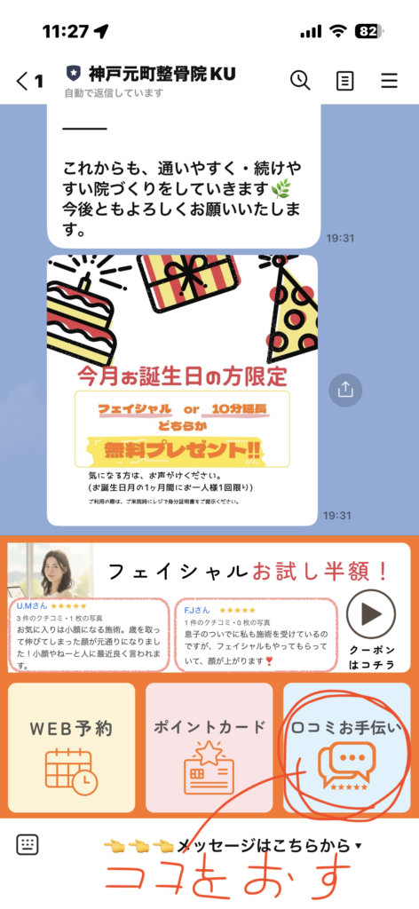 LINEやメールなどで送られてくるメッセージ内の「口コミお手伝い」ボタンをタップして、専用のフォームページを開きます。