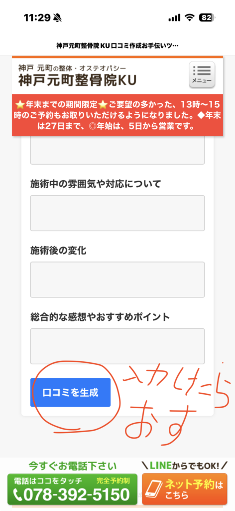 すべての項目を記入したら「口コミを生成」ボタンを押します。入力内容をまとめた口コミ文が表示されるので、文章を長押ししてコピーします。コピーした文章は、このあとGoogleマップに貼り付けます。