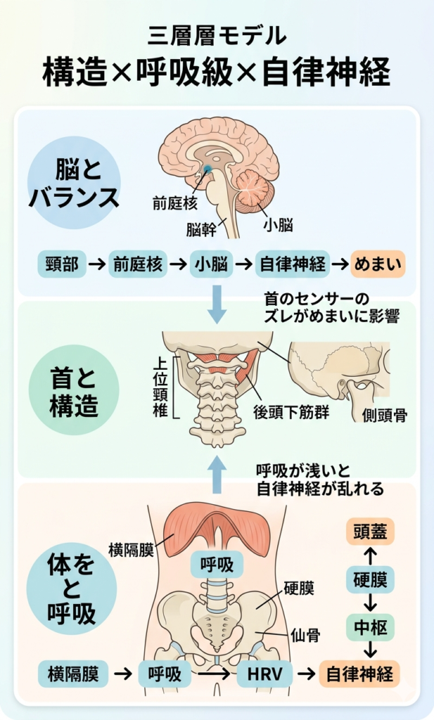 こうして見ると、頸性めまいは構造・呼吸・自律神経の3つを一緒に見ると理解しやすいテーマなのだと思います。