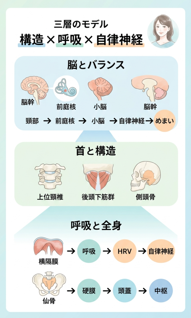 こういうめまいは、どこかが壊れているというより、首・呼吸・姿勢・自律神経の連携がズレている可能性があります。