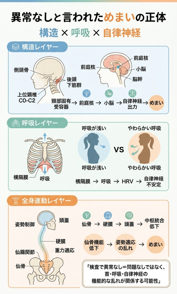 とくに、首、前庭系、自律神経、呼吸、姿勢制御の連携が乱れると、ふわふわしためまいとして出てくる可能性があります。